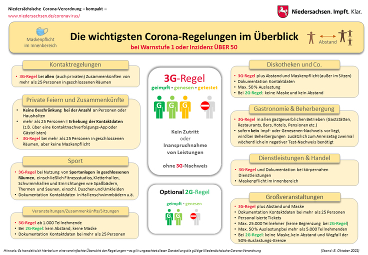 Laut Entwurf spielt darin die von Bund und Ländern vereinbarte 3G-Regel eine wichtige Rolle. Niedersächsische Corona-Verordnung - kompakt - Stand. CovPass oder Corona-Warn-App oder entsprechende offizielle Bescheinigungen.